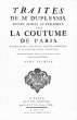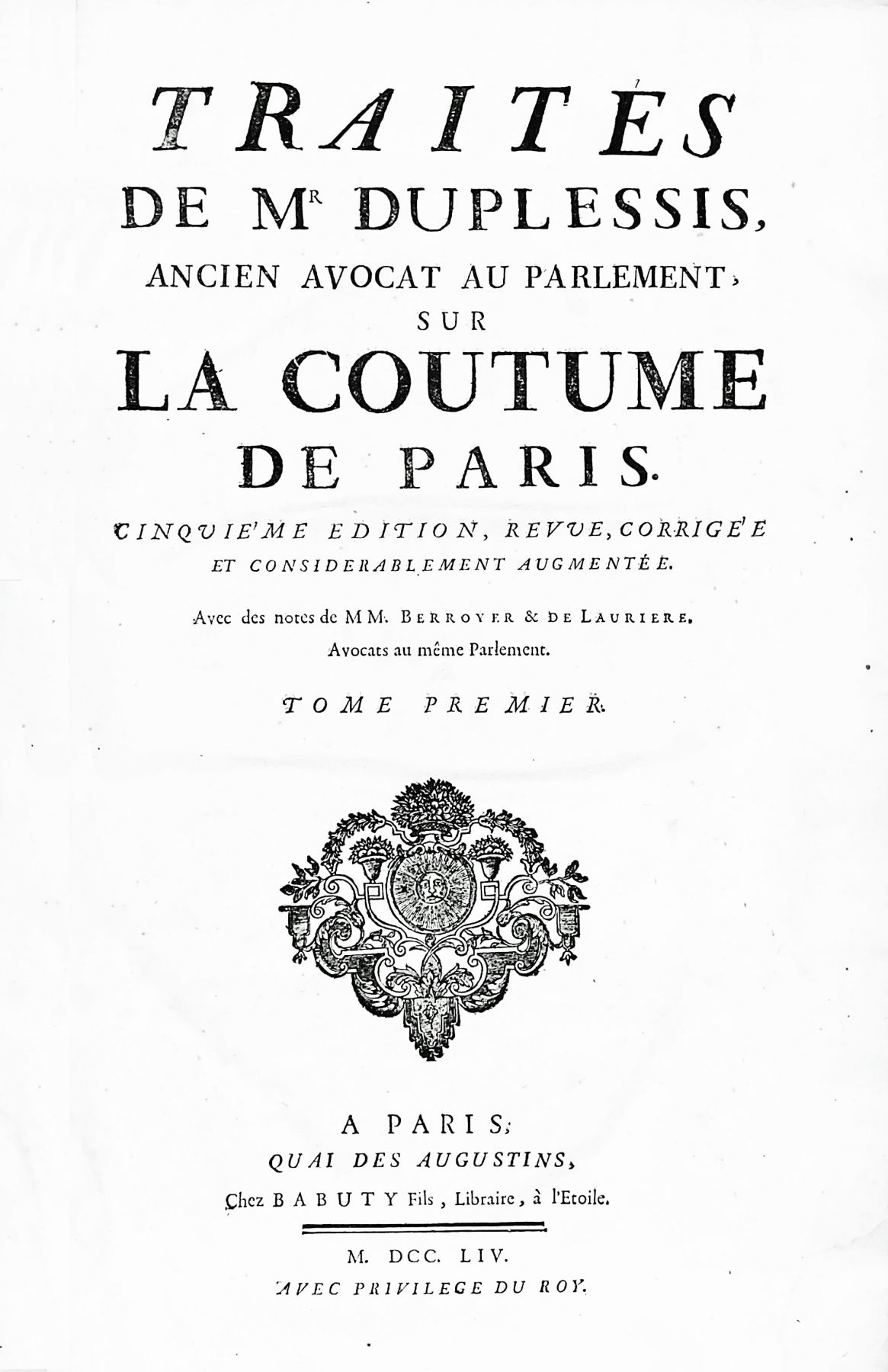 DUPLESSIS Claude. Œuvres ou Traités sur la coutume de Paris (tome I). Cinquième édition, revue, corrigée et considérablement augmentée. Avec des Notes et MM .Claude Berroyer et de Eusèbe-Jacques de Laurière. Paris, chez Babuty fils, 1754 puis: Œuvres (tome II). Paris, chez Nicolas Gosselin, 1728; 2 volumes in-folio, veau brun raciné, dos à nerfs orné de fleurons dorés, pièces de titres et de tomaison en maroquin bordeaux et noir, tranches rouges, bandeaux lettrines et culs-de-lampe, coiffes absentes, mouillures claire, rares piqûres ou rousseurs.