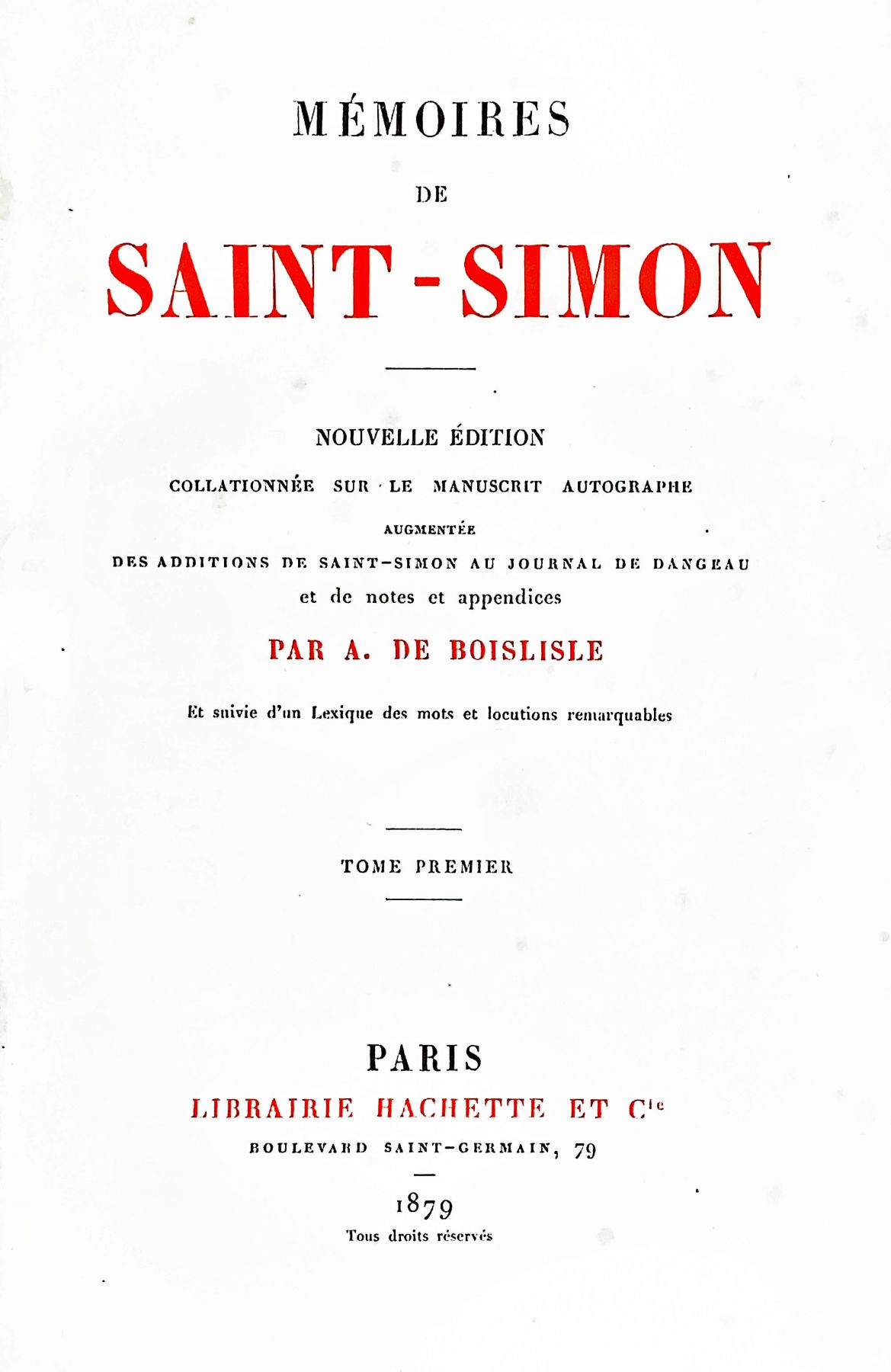 SAINT-SIMON Louis de Rouvroy, duc de. Mémoires. Nouvelle édition collationnée sur le manuscrit autographe, augmentée des additions de Saint-Simon au Journal de Dangeau, et de notes et d’appendices par Arthur de Boislisle puis Léon Lecestre et J. de Boislisle. Et suivie d'un lexique des mots et locutions remarquables Paris, Hachette et Cie, 1879-1930; 43 volumes in-8, broché. De la collection « Des Grands écrivains de la France ».