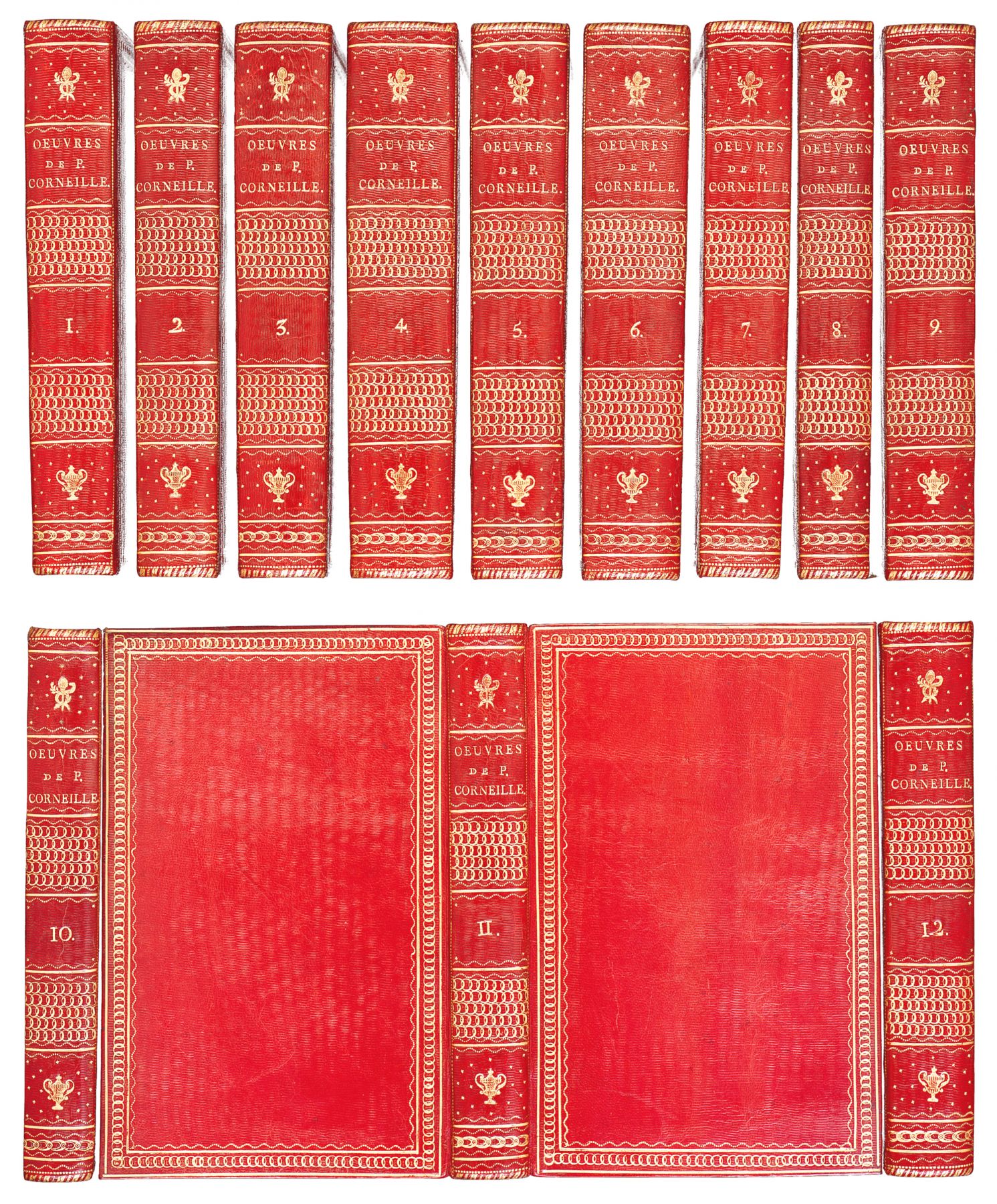 CORNEILLE. Oeuvres. Avec les commentaires de Voltaire sur les pièces de théâtre et des observations critiques sur ce commentaire par le sieur Palissot. Edition complète dédiée à Bonaparte, premier Consul de la République française. A Paris, P. Didot l’aîné, An IX [1801]. 12 volumes in-8 [219 x 138], maroquin rouge à long grain, roulettes multiples dorées en encadrement sur les plats, dos lisses ornés et dorés, coupes décorées, tranches dorées (Reliure de l’époque).Belle et élégante édition typographique, imprimée par Didot. Elle renferme des œuvres diverses et la traduction en vers de l’Imitation de J.-C. qui ne figurent pas dans l’édition de 1764.Exemplaire sur papier vergé, enrichi de la suite complète de 26 figures dont deux portraits publiés pour l’édition de 1817 chez Renouard. Magnifique exemplaire en maroquin décoré de motifs néo-classiques.
