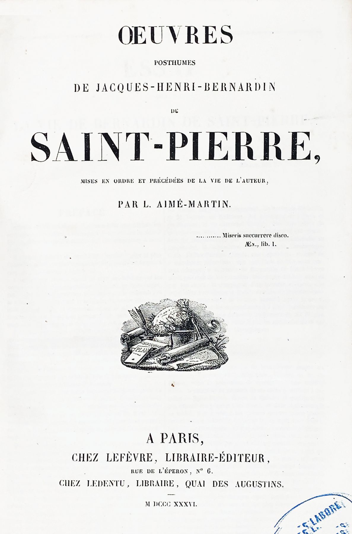 SAINT-PIERRE J.-H. Bernardin de. Œuvres et Œuvres posthumes. Nouvelle édition, augmentée de divers morceaux inédits, mise en ordre et précédée de la vie de l'auteur par L. Aimé-Martin. Paris, Lefèvre, Ledentu, 1836; 2 volumes in-4, demi-chagrin brunde l’époque, dos à nerfs orné, titre et dorés. Même édition que celles publiées en douze volumes, mais dans le format in-4 sur deux colonnes. Illustré du portrait de l’auteur en frontispice et de nombreux planches hors-texte en noir et blanc. Elle comprend les titres suivants: Vie de Bernardin de Saint Pierre. - Voyage à l'Ile de France. - Etudes de la nature. - Paul et Virginie, la Chaumière indienne. - L'Arcadie. - Harmonies de la nature. - Voeux d'un solitaire: Essai sur J.J. Rousseau. - Dialogues philosophiques.
