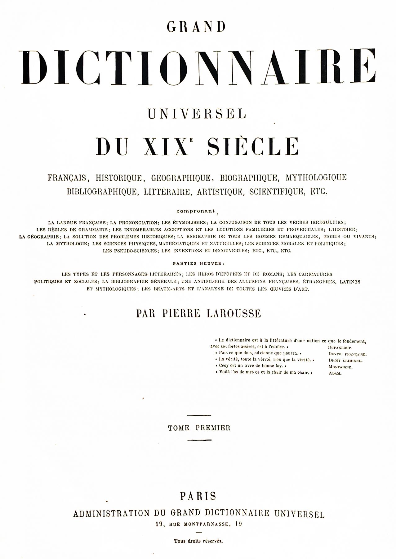 LAROUSSE Pierre. Grand dictionnaire universel du XIX ème siècle. Français, historique, géographique, mythologique, bibliographique, littéraire, artistique, scientifique, etc. par Pierre Larousse. Paris, Larousse, 1866-1890; 17 volumes grand in-4, demi-chagrin noir de l’éditeur, plats en percaline décorés à froid. Les tome 16 et 17 de supplément sont en réimpression à l’état de neuf et reliure différente. Orné du portrait-frontispice de Pierre Larousse d'après un buste de Perraud. Bon exemplaire, sans cahiers déboîtés.