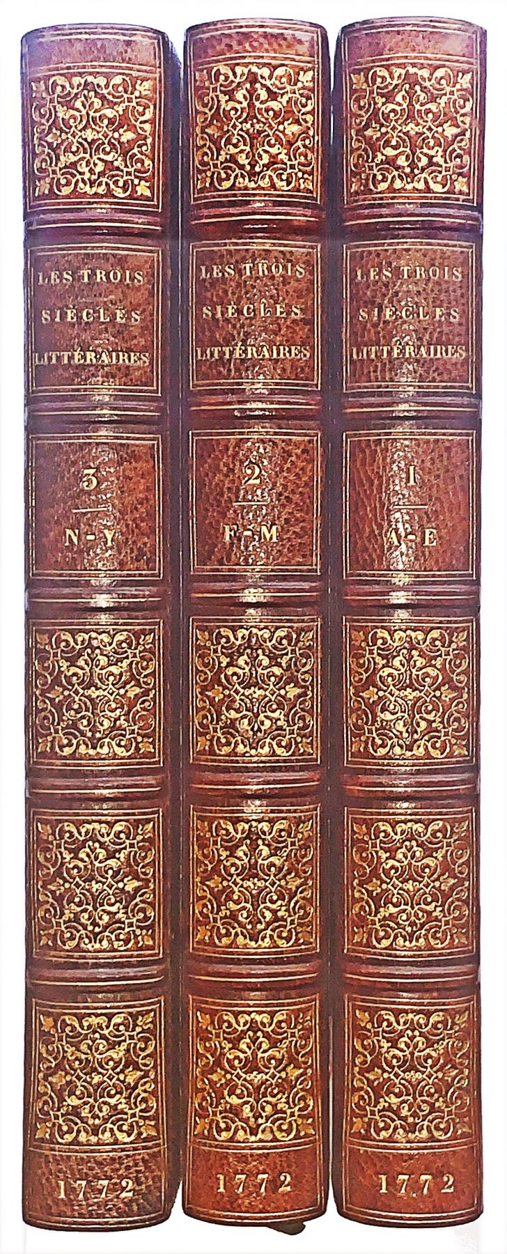 SABATIER DE CASTRES Antoine. Les Trois Siècles de notre Littérature, ou Tableau de l’Esprit de nos écrivains, depuis François Ier, jusqu en 1772: par ordre alphabétique. Amsterdam, et se trouve a Paris, chez Gueffier et chez Dehansi, 1772, 3 volumes in-8 [190 x 120 mm], demi-maroquin havane, dos à nerfs richement orné de filets et de fleurons dorés, plats, tranches et gardes marbrées (Reliure ancienne).