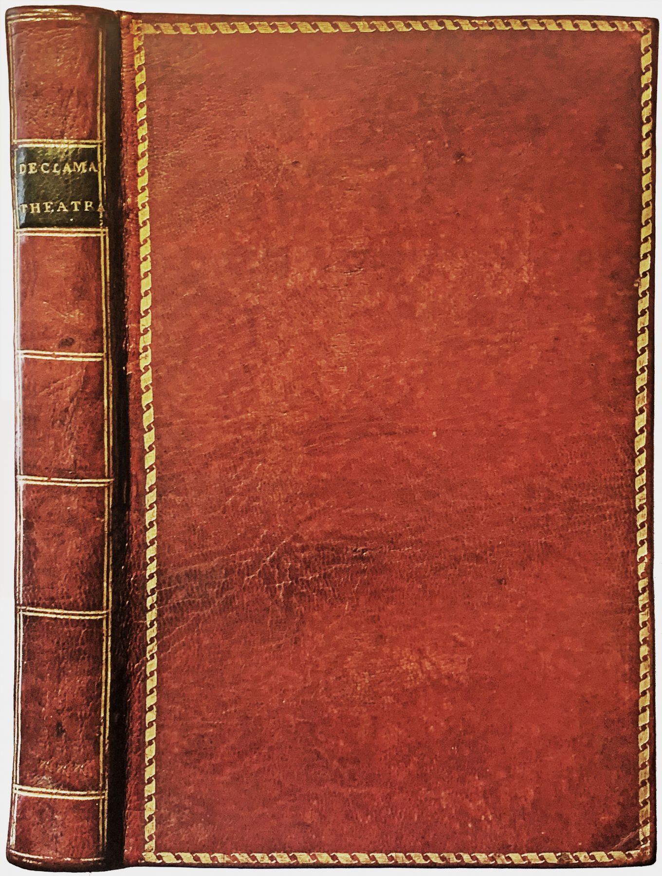 DORAT Claude Joseph. La Déclamation Théâtrale. Poëme Didactique en Trois Chants, précédé et Suivi de quelques Morceaux en Prose. Paris, Chez Delalain, 1771, in-8 [198 x 130 mm], maroquin rouge de l’époque, dos lisse orné de caissons dorées, pièce de titre en maroquin vert, guirlande torsadé en entourage sur les plats, roulette dorée sur les coupes, tranches dorées, roulette intérieure, gardes de papier bleu.