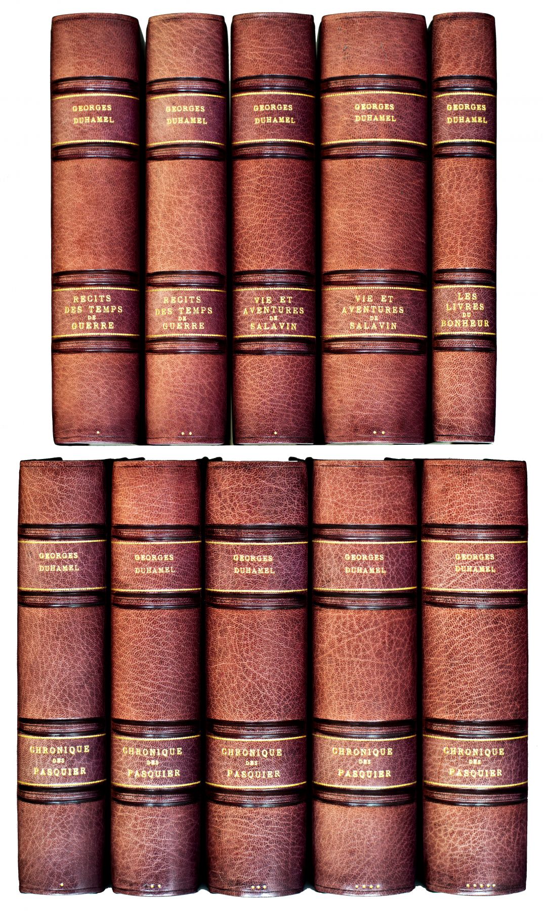 DUHAMEL Georges. Œuvres. Paris, Mercure de France, 1947-1950. 27 tomes reliés en10 volumes in-8 [203 x 146 mm], demi-maroquin violet, dos à nerfs ornés, non rognés, couverture et dos conservés (Reliure de l’époque).