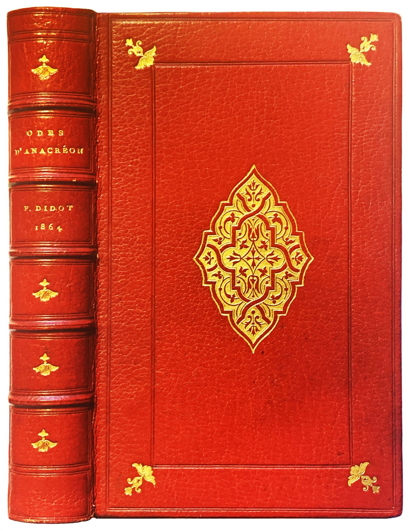 ANACREON - Girodet-Trioson [Anne-Louis, illustrations de] - Firmin-Didot [Ambroise, traduction de]. Odaria Anakreontos ou Odes d’Anacreon. Paris, Firmin Didot, 1864. In-12 [138 x 85 mm] de 2 ff. bl., 2 ff. n.fol., xlvii - 158 pp. y compris 6 pp. de table, et 2 ff. bl., maroquin rouge, plats ornés d'un décor à la « Du Seuil » comportant deux doubles filets d'encadrement à froid avec fleurette d’angles dorés, large fleuron doré au centre, dos à nerfs orné de caissons à froid avec fleurons dorés, titre doré, double filet sur les coupes, tranches dorées, dentelle intérieure. (Smeers).Texte en grec avec la traduction française d'Ambroise Firmin-Didot. Anacréon se consacre principalement à la poésie amoureuse et à la poésie de banquet. Son style se caractérise par sa légèreté doublé de son charme. Texte encadré d'un double filet rouge agrémenté de délicats ornements typographiques ainsi que de 54 planches photographiques sur papier albuminé appliquées d'après Girodet. Très bel exemplaire en maroquin rouge signée Smeers.