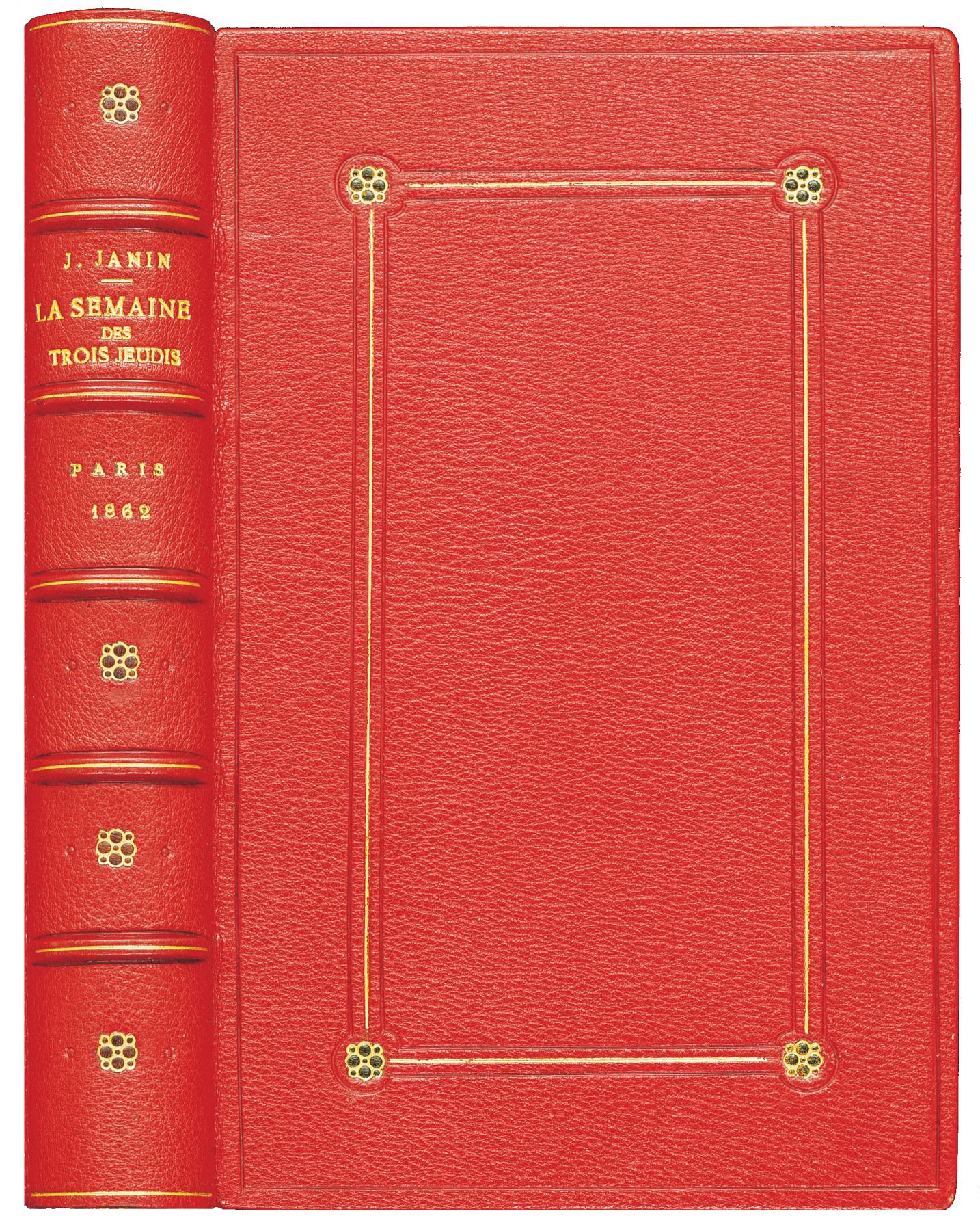 JANIN Jules. La Semaine des Trois Jeudis. Paris, Morizot, 1862. In-12 [181 x 112 mm], maroquin rouge, double cadre de filets dorés et à froid avec fleurons d’angles sur les plats, roulette intérieure, double filet sur les coupes, tranches dorées, étui. EDITION ORIGINALE. Illustrée de 4 figures hors-texte d’après Telory et gravées sur bois par Pegard. Plaisant exemplaire très bien imprimé.