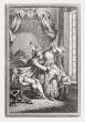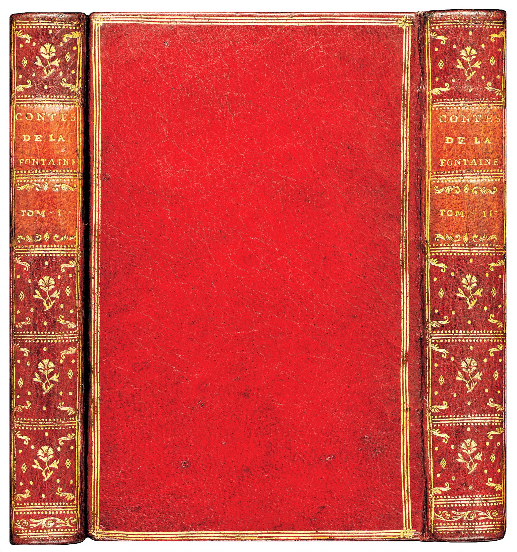 LA FONTAINE Jean de. Contes et Nouvelles en vers. A Amsterdam [Paris, Jean-Joseph Barbou], 1762. Deux volumes petit in-8 [179 x 118 mm], maroquin grenat, dos lisses ornés cloisonnés et fleuronnés, pièces de titre et de tomaison de maroquin bruns, triple filet doré encadrant les plats, filet doré sur les coupes, petite roulette intérieure, tranches dorées (Reliure de l’époque). Premier tirage. Célèbre édition dite des «fermiers généraux», car elle fut publiée à leurs frais. Notice de Denis Diderot. Deux portraits-frontispices, 80 figures d’après Charles Eisen, 4 vignettes et 53 culs-de-lampe par Choffard. Les figures du Cas de conscience (II, 143) et du Diable de Papefiguière (II, 148/149) sont découvertes. Enrichi de quatre planches refusées: Le Calendrier des vieillards (I, 68/69, montée sur feuillet de papier), - La Coupe enchantée (I, 140/141), - La Clochette (I, 218/219), - Le Tableau (II, 222/223, très libre). BEL EXEMPLAIRE relié en MAROQUIN ROUGE STRICTEMENT DE L’époque. Petite mouillures claires marginales. Quelques feuillets jaunis et roussis.