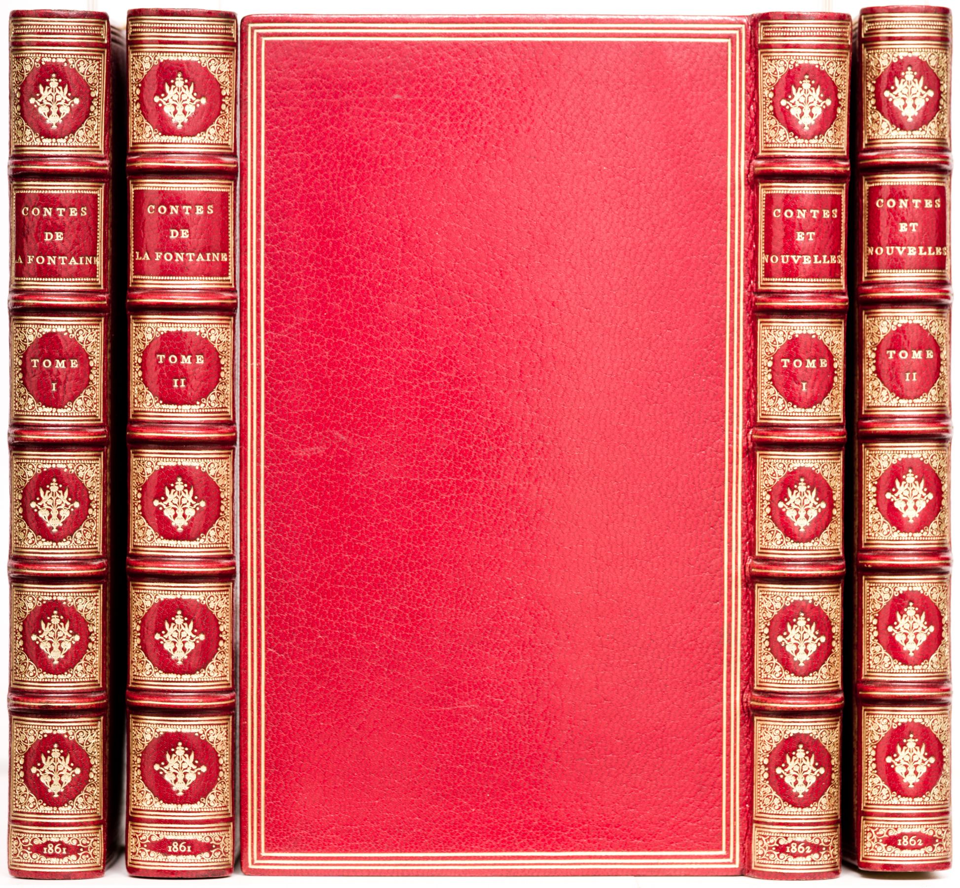 LA FONTAINE Jean de. Contes et Nouvelles en vers. Suivi de: Contes et Nouvelles en vers de Voltaire, Vergier, Sénecé, Perrault, Moncrif, ducerceau, Grécourt, Saint-Lambert, Champfort, Piron, Dorat, La Monnoye et François de Neufchâteau. Paris, Leclère fils, 1861-1862. 4 volumes in-12 [183 x 110 mm], maroquin rouge, triple filet doré sur les plats, dos à nerfs richement ornés et dorés de caissons et aux petits fers, dentelle intérieure, double filet sur les coupes, tranches dorées (Lortic). Recueil des meilleurs contes en vers. édition illustrée d’un frontispice et de cent douze jolies vignettes en tête, gravées à l’eau-forte. Luxueuse publication tirée à seulement cent exemplaires imprimée sur papier vélin. Très bel exemplaire magistralement relié en maroquin rouge par Lortic.