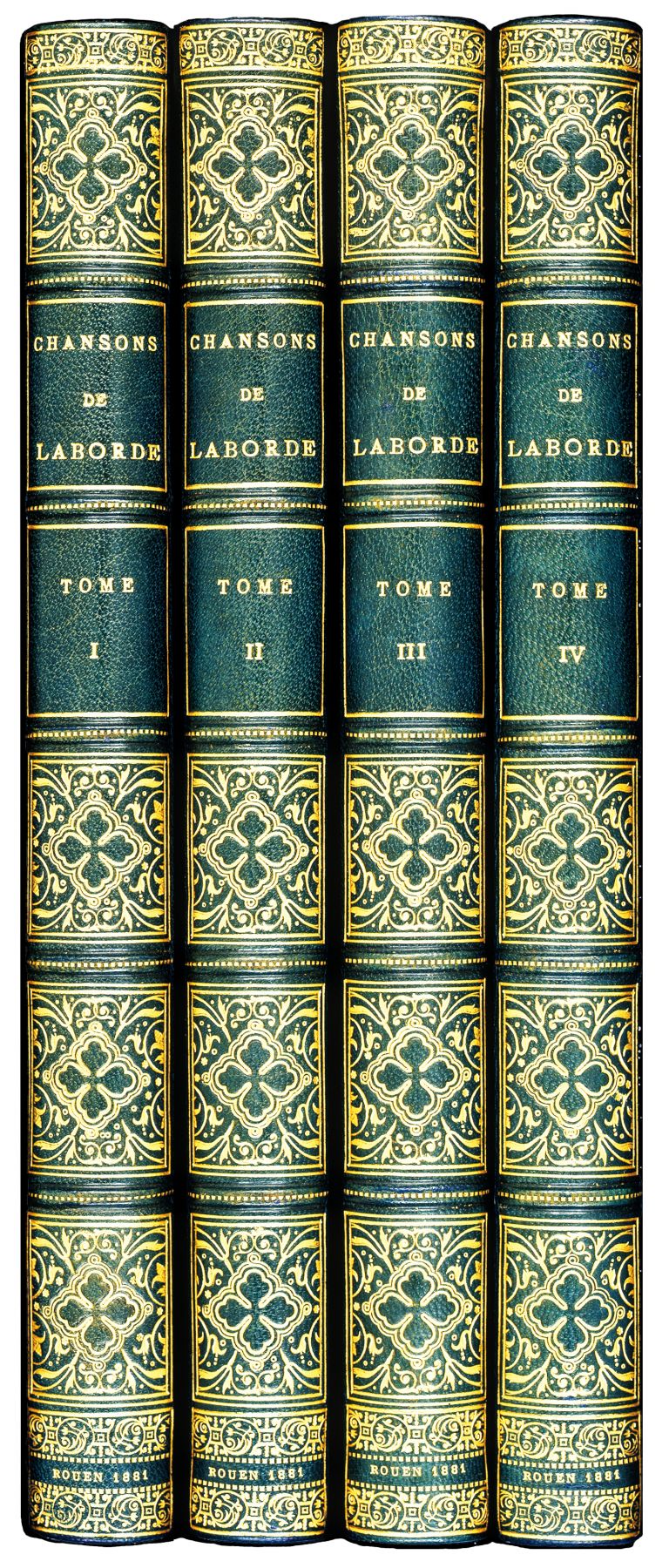 LABORDE Benjamin de. Choix de Chansons mises en musiques. Rouen, Lemonnyer, 1881. 4 volumes grand in-4 [272 x 180 mm], demi-maroquin bleu à coins, dos à nerfs richement ornés et dorés, têtes dorées, non rognées (Smeers - Engel). Reproduction de l’édition de 1773. Orné d’un portrait de l’auteur, de 4 frontispices, d’un titre gravé et de cent figures par Le Barbier, Moreau-le-Jeune et Saint-Quentin. Bel exemplaire sur vergé de Hollande.