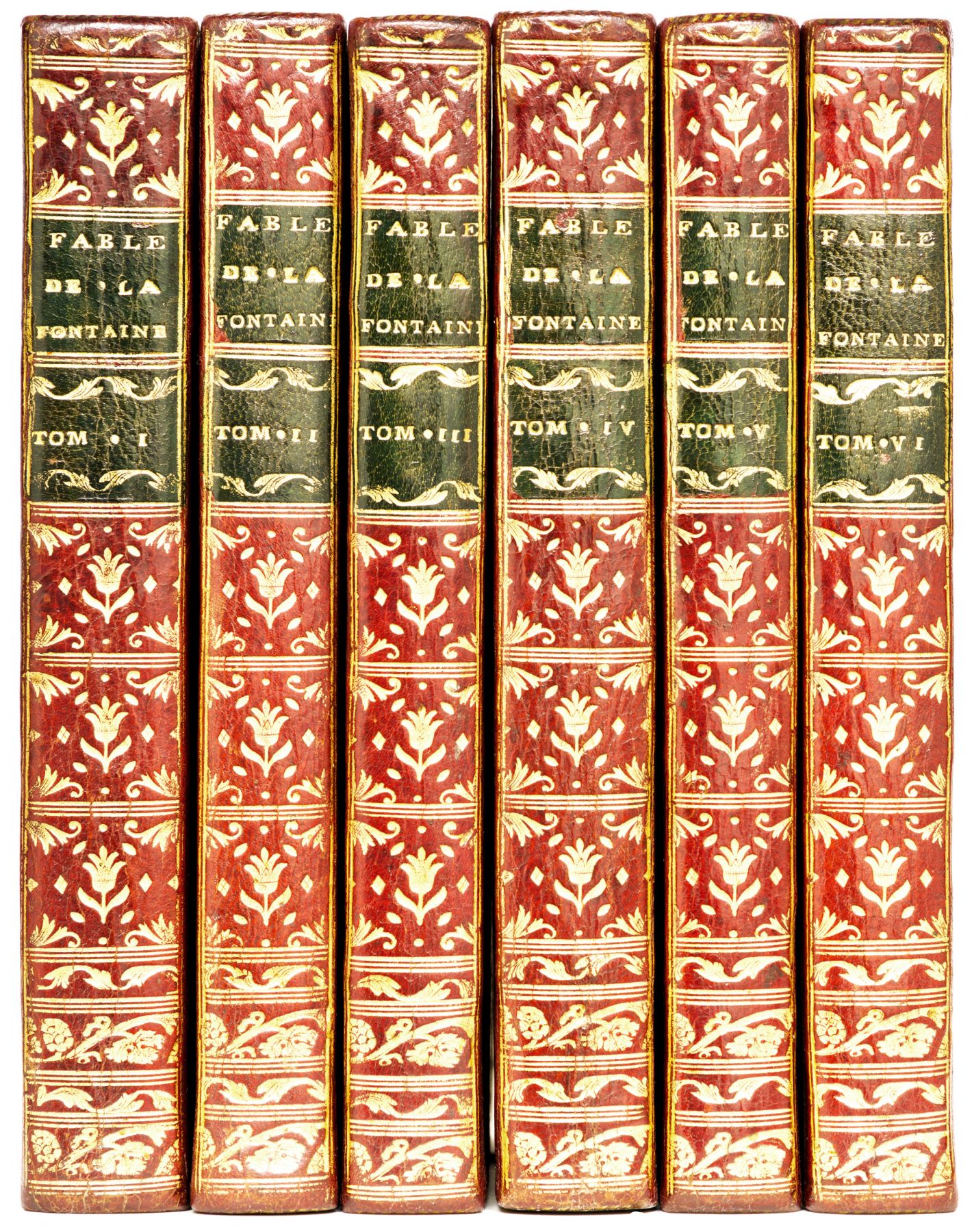 LA FONTAINE Jean de. Fables choisies, mises en vers. Nouvelle édition gravée en taille-douce. Les figures par le Sr. Fessard. Le texte par le Sr. Montulay. Dédiées aux Enfans de France. Paris, Chez l'auteur, graveur ordinaire du Cabinet du Roy, 1765-1775. 6 volumes in-8 [185 x 119 mm]: maroquin rouge, dos lisses ornés, pièces de titre et de tomaison en maroquin vert, encadrement d’un triple filet doré avec fleurons d’angle sur les plats, coupes filetées et bordure décorées, tranches dorées (Reliure de l’époque).